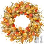- WELL-MADE This autumn wreath is made of high quality silken cloth and fiber, handmade by florists, realistic shape and full of colors. The outdoor wreath base is durable natural grapevine, strong and durable, not easy to fall off. The fall door wreath is packaged in a relatively small box for shipping requirements, and the branches can be adjusted for the perfect shape when disassembled.