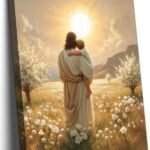 • 【Jesus With Boy In the Field Wall Art】This Jesus holding boy wall artoutlines a peaceful and warm scene: He is wearing a plain robe, holding a child and standing quietly in a field of flowers, with a warm sun in front of him, symbolizing the holy light. This painting embodies the spirit of protection and acceptance in the Bible and shows the love and kindness of Jesus. It is very suitable to be placed in a child’s bedroom so that Jesus’ love can warm the child and inspire faith.