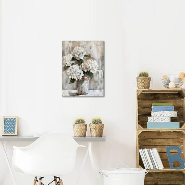 • White Hydrangea Canvas Wall Art Pictures, sized 12″ x 15″ (30cm x 38cm), is a small white blooming flower canvas wall art painting that comes with a canvas wrapped wooden frame and a hook, mounted and ready to hang. This retro flower landscape wall art view fits perfectly into cottage core decor, creating a feeling of calm and relaxation in your home interior decor scene.